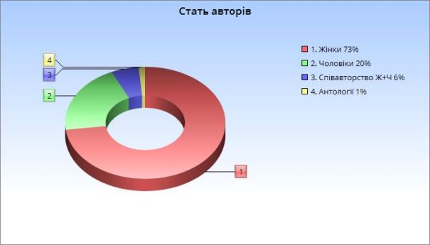 Зі статевим розподілом авторів все звично: читала більше книжок, написаних жінками, читаю і читатиму. Тут роками все плюс-мінус без змін.