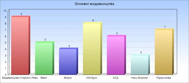 Ну й остання діаграмка – мої чемпіони. Тобто ті українські видавництва, в котрих я прочитала три і більше книжок. Перемога ВСЛ очікувана, а те, що КСД вилетів з призової трійки – ні.